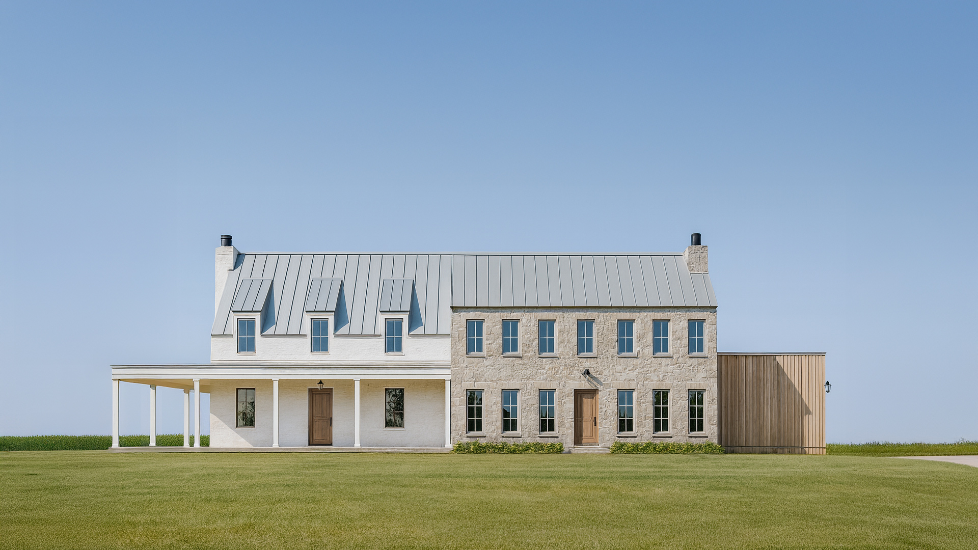 The Faarmsted Plus is featured above — a farmhouse design rooted in the quiet strength of the Hudson Valley. Inspired by early Dutch Colonial homesteads, it blends stone, wood, and simple forms into a home that feels timeless against open farmland.
